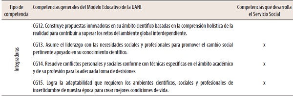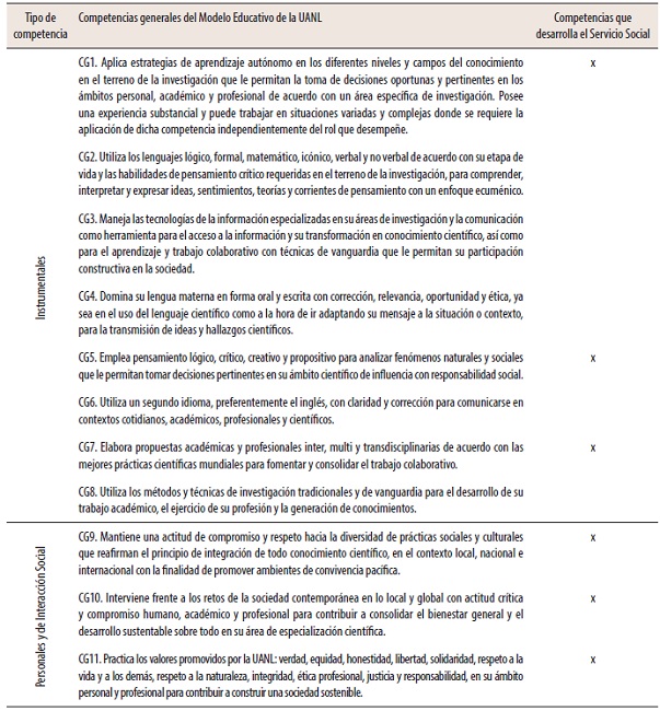 El modelo educativo de la UANL se compone de 15 competencias generales, clasificadas en tres categorías: instrumentales, personales y de interacción social, e integradoras. Como se muestra en la Tabla 4, la asignatura de Servicio Social contribuye al desarrollo de 9 de las competencias del modelo educativo.