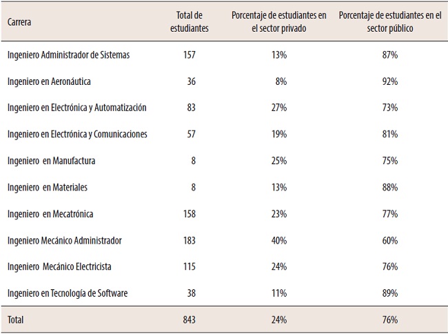En la Tabla 5 se observa que la población de estudiantes que realizó su servicio social en el periodo enero-junio 2014 fue de 843, es decir, que el número de proyectos fue también de 843. En cuanto a la distribución por sector de la dependencia en donde laboró, el 24% del estudiantado lo realizó en el sector privado (empresas del sector industrial y servicios) y el 76% en el público (instituciones gubernamentales, UANL y asociaciones civiles). Destacan los valores de la carrera de Ingeniero Mecánico Administrador, en la cual el 40% del estudiantado realizó su servicio social en el sector privado y 60% en el público.