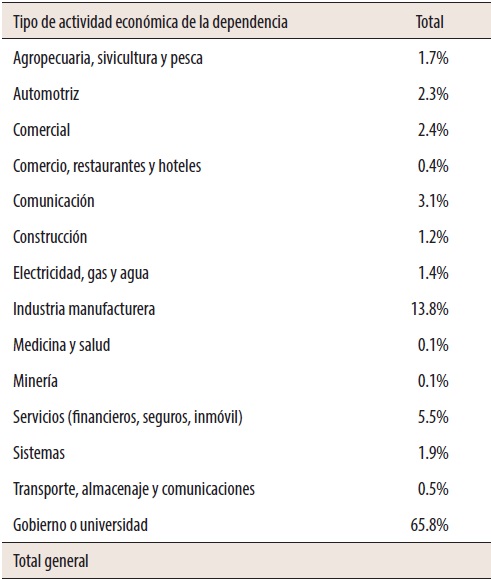 En la Tabla 6 se observa que la mayoría de los proyectos (65.8%) realizados en la asignatura de Servicio Social fueron en una dependencia de gobierno o en la universidad, como se mencionó antes, en el sector público. Seguido, desataca que el 13.8% de los proyectos se realizaron en la industria manufacturera y el 5.5% en el sector de servicios (financieros, seguros, inmóvil).
