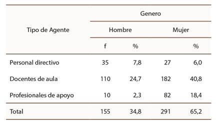 En relación con el género, se tiene en la Tabla 1, que en personal directivo hay mayor presencia en el género masculino, y de manera contraria entre docentes de aula y profesionales de apoyo. De manera global, hay un porcentaje mayor dado para el género femenino, alcanzó un 65,2% del total de la muestra.