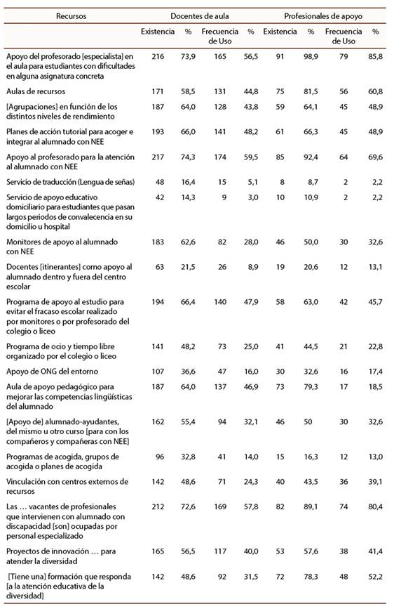 Esta dimensión es analizada (Tabla 12) desde la existencia del recurso, como también la frecuencia de su uso, desde la perspectiva de docentes de aula y profesionales de apoyo, en una muestra de 384 participantes.