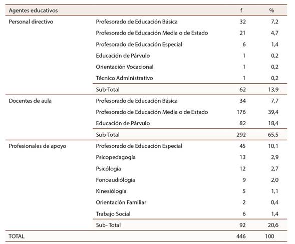 La muestra se define por la facilidad de los accesos y la voluntariedad de participar en el estudio, por tanto, es intencionada. Está constituida por un total de 446 agentes educativos, de los cuales, el personal directivo conforma el 13,9%, docente de aula un 65,5% y profesionales de apoyo a los niños, niñas y jóvenes que presentan necesidades educativas especiales, el 20,6%. Pertenecen a 30 establecimientos educacionales de los niveles de educación básica y media de las comunas de Curicó y Talca.
