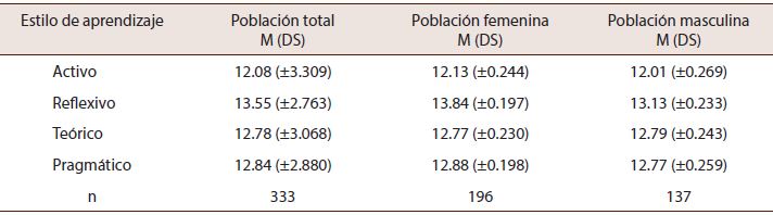 Como se muestra en la Tabla 1 se obtuvieron los valores promedio para los diferentes estilos de aprendizaje, resultando el más preponderante para el total de la población estudiada el estilo “Reflexivo” con una valor promedio y desviación estándar de 13.55 (±2.763). Semejante situación trasciende cuando se observa que este mismo estilo de aprendizaje, el “Reflexivo”, se muestra tanto para mujeres como para hombres, con valores 13.84 (±0.197) y 13.13 (±0.233), respectivamente.