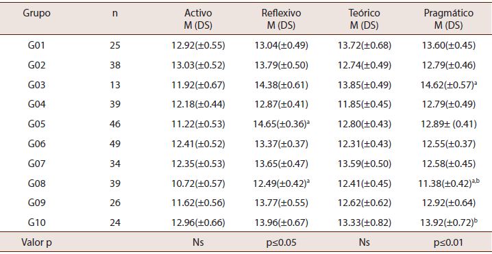 En relación con el análisis por grupos, se obtuvo que en el 80% (f=8) prevalecía un estilo de aprendizaje “Reflexivo”; mientras que con un 10% (f=1) imperaba tanto el estilo “Teórico” como el “Pragmático”. Por otra parte, se encontraron diferencias significativas entre los valores promedio cuantificados tanto para los estilos “Reflexivo”, como se observa entre el Grupo 05 y Grupo 08 con una confiabilidad del 95%, y en el “Pragmático”, como se advierte entre el Grupo 03 y Grupo 08, y Grupo 10 y el Grupo 08 con una confiabilidad del 99% respectivamente. No así, para los estilos Activo y Teórico (ver Tabla 2).