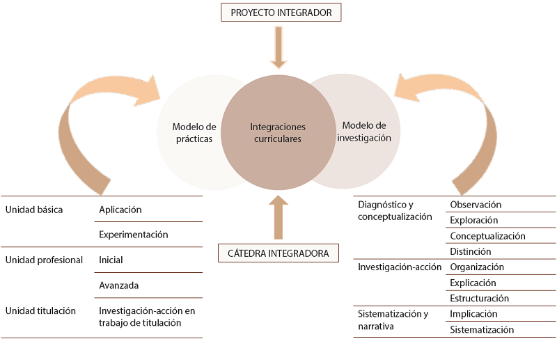 Si bien el formato del CES para la estructura de proyectos de carrera menciona el modelo de investigación antes del modelo de práctica, se insiste en que la construcción del proyecto no es necesariamente lineal. De acuerdo con el Reglamento de Régimen Académico, emitido por el CES (2013), artículo 89, “estas prácticas deberán ser de investigación-acción y se realizarán en entorno institucional, empresarial o comunitario, público o privado, adecuado para el fortalecimiento del aprendizaje…” (p. 41), lo que evidencia la estrecha relación entre estos dos modelos. Además, según el artículo 94 de la misma normativa, las prácticas pre profesionales deben estar articuladas a una o varias cátedras o asignaturas, las que corresponden a las cátedras integradoras que se mencionan en la sección anterior de integraciones curriculares.
