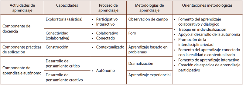 En este sentido, el modelo de aprendizaje contempla una relación entre los campos de formación y sus asignaturas al incorporar el uso de TIC, plataformas y otros medios educativos; todo esto en conexión con la era digital que ha invadido las aulas tradicionales, ya que al estar en una “sociedad global, basada en la información fundamentalmente digital, es necesario considerar seriamente el papel de las nuevas herramientas y plataformas por las que transita la información porque sin duda constituyen el factor central del cambio” (Pérez, 2013, p. 69), exigencias que quizá son soslayadas en la práctica docente, lo cual repercute y genera un aprendizaje aislado o una seudo movilización de resultados de aprendizaje hacia la consecución de competencias. En este contexto, es necesario que las metodologías de aprendizaje y orientaciones metodológicas se organicen en función de las actividades de aprendizaje y sus componentes, para lo cual se plantea una matriz que relaciona estos elementos, tal como se observa en la Tabla 1.