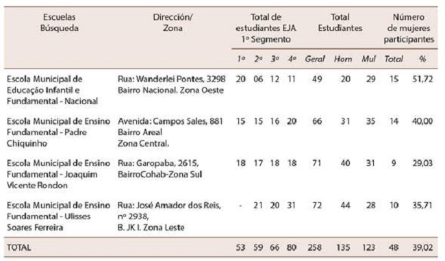En las cuatro escuelas participantes de la investigación, en total de 258 estudiantes que se matricularon en la EJA primer segmento en el período nocturno, el 39,02% de las mujeres fueron sometidas a la entrevista. En todas las cuatro escuelas el equipo de investigación tuvo acceso al aula y las entrevistas se realizaron individualmente.