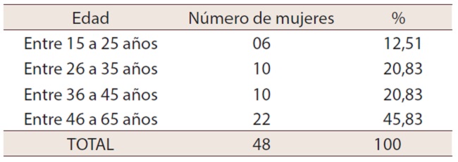 En cuanto a la edad y la profesión de las estudiantes entrevistadas, el 45,83% de ellas tiene edad entre 46 y 65 años y solamente seis mujeres tienen edad entre 15 a 25 años, según se especifica en la Tabla 2 y la Tabla 3.