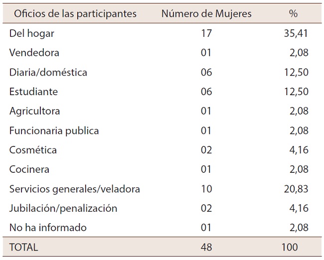 Participaron de esta encuesta 48 mujeres matriculadas en el primer segmento del curso de educación de jóvenes y personas adultas (EJA) de cuatro escuelas de la red municipal de enseñanza de la ciudad de Porto Velho (RO). El criterio de selección de las escuelas obedeció a la orden de localización en relación con las zonas de la ciudad.