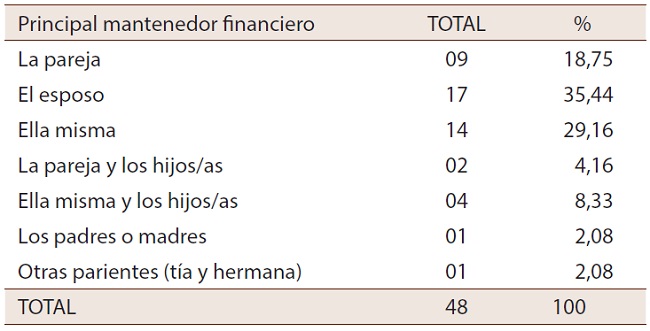 A pesar de estos cambios, lo que se planteó a través de los datos presentados en la Tabla 4, fue que aún el 35,44% de las mujeres entrevistadas tiene el esposo como el principal mantenedor financiero, seguido del 29,16% de mujeres que son las principales responsables del sustento de la familia.