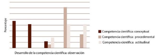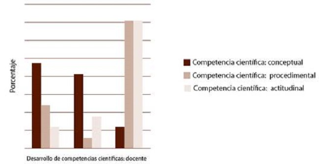 En cuanto a la competencia procedimental y actitudinal, existe una diferencia de criterio, por cuanto docentes refieren en un 71 % potenciarla algunas veces; sin embargo, en la observación no se vio el desarrollo de esas dimensiones. Por su parte, en la observación se identificó cómo el 71 % nunca desarrolla competencias científicas procedimentales, es decir, no utiliza instrumentos de medición y técnicas que permitan organizar y analizar la información, no evidencia en sus clases habilidades para la investigación ni la comunicación; lo anterior se contrasta con las preguntas relacionadas con el uso de recursos que potencien esa habilidad tales como: demostraciones, laboratorios actividades prácticas, dado que en promedio en un 94 % de los casos no se reflejaron en las clases.