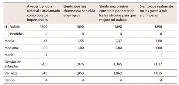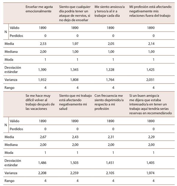 En la Tabla 1 se observan los estadísticos descriptivos por ítems de la subescala “agotamiento emocional”.