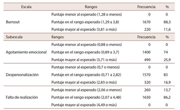 Las mayores frecuencias obtenidas en la escala de burnout y en sus subescalas se ubicaron en los rangos esperados (nivel medio de burnout); se obtuvieron frecuencias de puntajes mayores al esperado (nivel alto) en la escala de burnout y en dos de sus subescalas (agotamiento emocional y despersonalización); solo se obtuvieron frecuencias ubicadas en el rango menor al esperado (nivel bajo) en la subescala falta de realización.