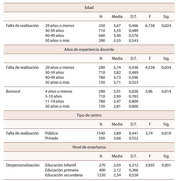 En el estudio se encontraron diferencias significativas en el nivel de burnout de docentes o en alguna de sus dimensiones en función de la edad, los años de experiencia docente, el tipo de centro y el nivel de enseñanza.