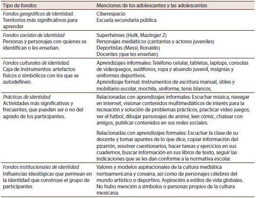 Respecto a los fondos de identidad de adolescentes, en la Tabla 1 se enuncian de manera cualitativa aquellos que aparecieron en las producciones elaboradas por ellos y ellas; la clasificación que realizamos coincide en gran medida con lo encontrado por Esteban-Guitart (2012), Poole (2017b) y Subero (2018).