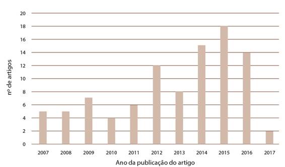 Na análise realizada no tocante ao momento da publicação, percebeu-se uma concentração maior de artigos publicados no ano de 2014(14), 2015(17) e 2016(14), totalizando quase a metade dos artigos triados nos 10 anos considerados para essa pesquisa. Essa concentração de artigos deve-se principalmente ao momento histórico das ações afirmativas no Brasil, uma vez que a Lei Federal n°.12.711 de 2012 exigia que: