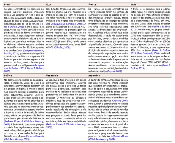 Na Tabela 2 estão descritas algumas ações afirmativas praticadas no ensino superior em diversos países, inclusive no Brasil. A análise deste quadro é importante para verificar a eficiência das políticas em outros países que as adotaram há mais tempo. O que cabe esclarecer, é que cada ação foi pensada dentro de um contexto político, econômico e social, não sendo possível, simplesmente, reproduzir a política que teve sucesso em um país e aplica-la ao Brasil. É importante explicitar que as ações expostas não são as únicas nestes países, mas aquelas citadas nos artigos pesquisados.