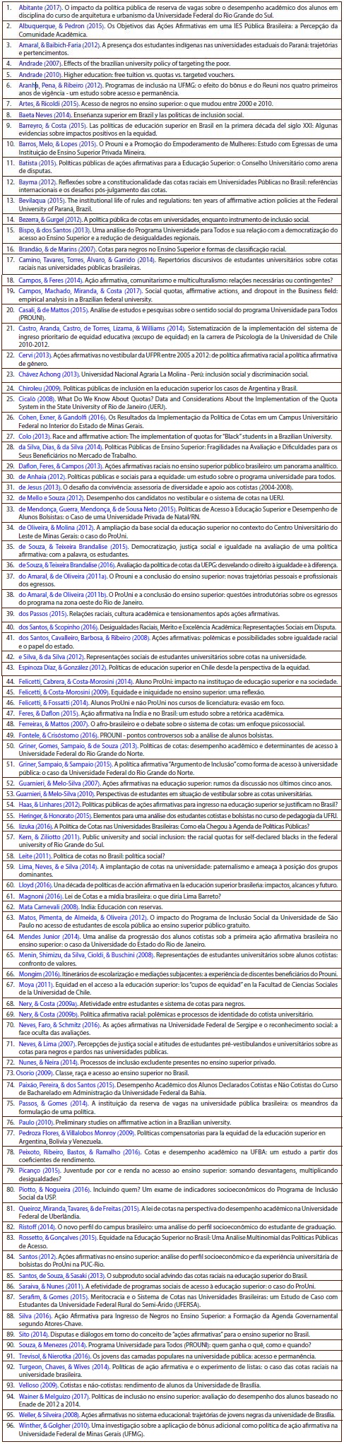 As variáveis analisadas qualitativamente foram categorizadas, após a leitura integral dos artigos, organizadas da seguinte forma: ações afirmativas no ensino superior em outros países; desempenho no acesso e na permanência entre alunos cotistas e/ou não-cotistas; estudos de caso em instituições de ensino superior específicas; momento histórico da publicação dos artigos; a questão da eficiência e eficácia das ações afirmativas para as instituições de ensino, para os indivíduos e para a sociedade. Para análise dos materiais selecionados e determinação das variáveis qualitativas, tendo em vista a heterogeneidade das metodologias e temáticas dos artigos, considerou-se o método de análise de conteúdo proposto por Bardin (2010), quando na exploração do material, para que as unidades de significado semelhantes fossem agrupadas, considerando recortes semânticos (temas) e linguísticos. Para isso, foram previamente concebidos que cada artigo estivesse em apenas um agrupamento por análise e que houvesse pertinência e objetividade da publicação com o objetivo da pesquisa. Ao final da análise dos artigos selecionados, foi feita uma síntese dos principais achados de acordo com cada variável. Ao longo de todo o trabalho houve o cuidado para seguir todos os preceitos éticos norteadores de uma pesquisa de revisão com constante verificação de dados, inclusão do artigo em caso de dúvida, autenticidade dos dados, devida referência aos materiais, clareza quanto a métodos e procedimentos. Conforme sua natureza crítica, esta revisão carrega consigo olhares e entendimentos dos seus pesquisadores, não necessariamente generalizáveis. Dessa forma, este estudo não traz consigo a passividade do pesquisador na mera agremiação e sintetização dos dados quantitativos, busca-se também explorar e refletir sobre as ações afirmativas/sistema de cotas ou outras denominações afins de forma a contribuir com o desenvolvimento nos campos das ciências exatas e sociais aplicadas. Os 96 artigos e suas referências encontram-se no Tabela 1.