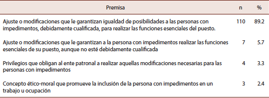 El segundo instrumento exploraba el conocimiento de las personas participantes sobre el acomodo razonable. Lo primero que se preguntó fue de qué índole es el acomodo razonable. La mayoría de quienes participaron entienden que es un aspecto legal con un 83.19 % (n=99). El 8.40 % (n=10) indicó que es un aspecto de índole académico, el 3.36 % (n=4) entiende que es de índole ético y el 5.04 % (n=6) restante entiende que es de índole social. Luego se presentaron varias definiciones de acomodo razonable donde cada participante debía seleccionar la mejor alternativa. Dentro de las definiciones ofrecidas de acomodo razonable, la mayor parte (89.2 %) seleccionaron un ajuste o modificaciones que le garantizan igualdad de posibilidades a las personas con impedimentos, debidamente cualificada, para realizar las funciones esenciales del puesto, como la definición de lo que es un acomodo razonable. Por otra parte, otras definiciones se presentan en la Tabla 1. Estas evidencian que aún existe confusión en cuanto a lo que es un acomodo.