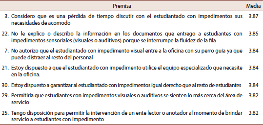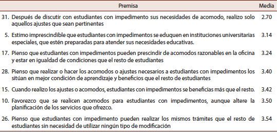 Por otra parte, hubo premisas que obtuvieron mayor variabilidad o dispersión en las respuestas. Un ejemplo lo es la premisa Después de discutir con el estudiante con impedimento sus necesidades de acomodo, realizo solo aquellos ajustes que sean pertinentes. Un 30.21 % estuvo totalmente de acuerdo y un 32.29 % de acuerdo, mientras que un 14.58 % en desacuerdo y un 22.92 % totalmente en desacuerdo, para un promedio de 2.70; esta es la premisa con mayor variabilidad en sus respuestas y el promedio más bajo. Aunque no se exploró una posible explicación a esta variabilidad, puede estar relacionada con las preocupaciones y la falta de conocimiento sobre el tipo de acomodo apropiado. En relación con este aspecto, Schreuer y Sachs (2014) establecen que existe la necesidad de proveer mayor adiestramiento y conocimiento sobre cómo proveer y utilizar los acomodos de forma apropiada. Otro ejemplo de aseveraciones con variabilidad en respuestas es Estimo imprescindible que estudiantes con impedimentos se eduquen en instituciones universitarias especiales, que estén preparadas para atender sus necesidades educativas. El 48.54 % estuvo en total desacuerdo. Un 29.13 % expresó estar en desacuerdo, mientras que un 22.33 % entre de acuerdo y totalmente de acuerdo. La Tabla 3 presenta otras premisas cuyo promedio es menor a los 3.60, considerado una actitud favorable.
