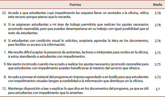 Como se mencionó, anteriormente, la puntuación más alta fue 3.87 con un 95.15 % en desacuerdo con la premisa Considero que es una pérdida de tiempo discutir con el estudiante con impedimento sus necesidades de acomodo. Esto es cónsono con la bibliografía, la cual establece que como parte del proceso interactivo de acomodo razonable siempre se debe discutir con la persona que solicita el acomodo sus necesidades y cómo entiende que se puede compensar (Shaw, 2017). En la Tabla 2 se pueden observar otras de las premisas con menor variabilidad en las respuestas, donde las personas participantes demostraron una actitud sumamente favorable, estas son las premisas que obtuvieron un promedio de 3.81 o más.