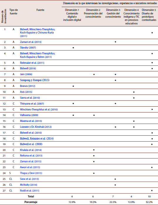 En la revisión bibliográfica, se identificaron 5 dimensiones en las investigaciones o experiencias que abonan en el contexto del conocimiento indígena y TIC, algunas investigaciones inciden en más de una dimensión, además de que los trabajos aportan de manera indirecta en alguna de las otras, por lo que fueron los objetivos de las investigaciones los que determinaron la dimensión correspondiente.