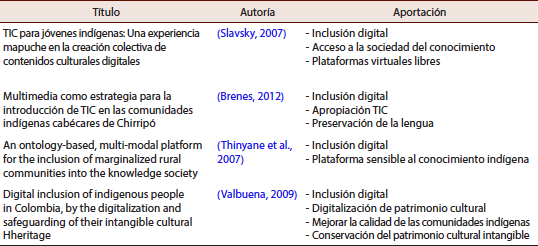 A partir del análisis realizado en la revisión bibliográfica, se identifica que las tres dimensiones proveen de elementos adecuados para la promoción y preservación del conocimiento indígena en el ámbito educativo formal, con el uso de las TIC. Estas últimas, identificadas como herramientas que además de potenciar la preservación incorporan a las poblaciones indígenas al mundo digital.