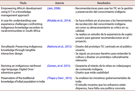 En la revisión de la bibliografía fue posible identificar diversas investigaciones, experiencias, iniciativas gubernamentales y revisiones de textos e investigaciones que abonan al tema del conocimiento indígena y las TIC, así mismo se pudo identificar que estas se encuentran distribuidas en cinco dimensiones.
