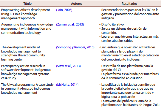 El documento presentado por Jain (2006) hace una serie de recomendaciones para la gestión del conocimiento indígena en particular en Sudáfrica. Zaman et al. (2013) en Malasia (Sompong y Rampai, 2015) realizan un análisis respecto a los centros comunitarios de aprendizaje en Tailandia, en su trabajo lograron identificar que las políticas implementadas para la recolección del conocimiento indígena son insuficientes, en tanto no existe un proyecto a largo plazo.