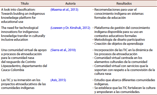 El reconocimiento del conocimiento indígena para usarse en contextos educativos, el diseño de plataformas individuales para acceder al conocimiento indígena, así como el desarrollo de objetos de aprendizaje con base en el conocimiento y el contexto indígena son las categorías de esta dimensión. La incursión de las TIC en el contexto educativo es un tópico que ha generado multitud de investigaciones, sin embargo, el tema del conocimiento indígena y las TIC en los procesos educativos es un tema poco abordado. Algunos países, como Canadá, han empezado a retomar el conocimiento indígena para incluirlo en los contextos educativos formales (Cházaro, 2014). En la Tabla 5 se muestran algunos estudios relacionados con esta dimensión.
