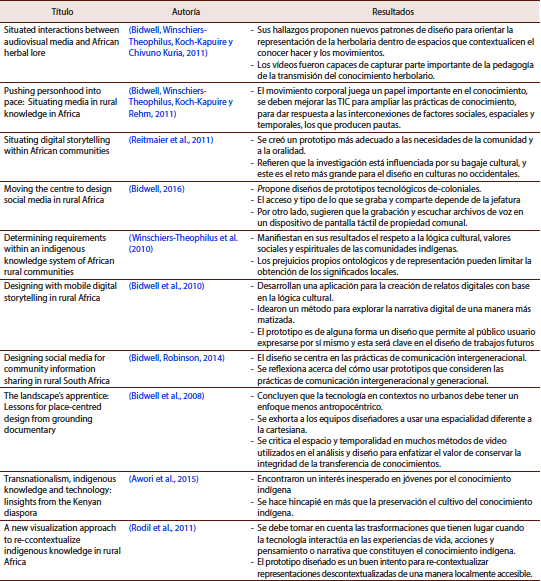 Por su parte Bidwell (2016) propone el diseño de prototipos desde una perspectiva de-colonial en tanto que, al tenerse una formación opuesta a los sistemas de conocimiento indígena y completamente occidental, los diseños suelen estar permeados en su totalidad de esta formación, lo que limita la propuesta de diseños más apegados al contexto indígena. Las investigaciones y sus principales aportaciones se muestran en la Tabla 6.