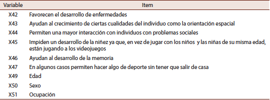 Las variables que se han definido en el cuestionario (ver Tabla 2) recogen información, por un lado, sobre las percepciones que los grupos consumidores poseen acerca de los beneficios o daños que pueden hacer los videojuegos (variable métrica medida con escala de Likert de 5 puntos), por otro lado, variables categóricas que recogen información sobre el perfil demográfico (edad, sexo) y su ocupación actual.