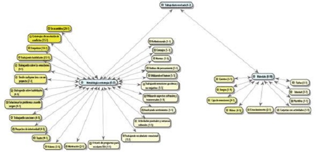 En referencia al primero, es decir, qué metodologías se emplean para educar la IE, cabe destacar que las 4 respuestas más repetidas han sido: en asamblea (n = 20), estrategias de resolución de conflictos (n = 15), empatizar (n = 13) y trabajando habilidades (n = 12).