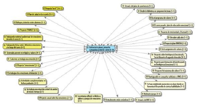 En cuanto a los programas, proyectos o planes que existen a nivel de centro educativo para educar la IE en todos los cursos, cabe destacar que se han generado 30 códigos (Figura 3). Los más frecuentes son proyecto en ti (n = 14) y el plan de salud en la escuela (n = 13). Seguidamente, 9 códigos, cuya representación es de entre 3 y 5 docentes. Y, por último, 19 códigos que recogen la información emitida por 2 o menos docentes.