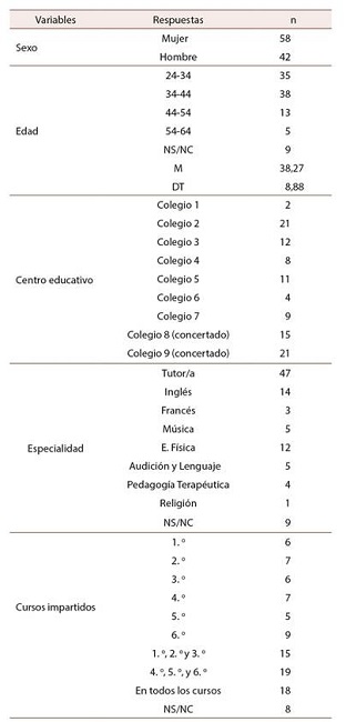 La población de la presente investigación está basada en docentes de educación primaria de una ciudad de la Región de Murcia, (España) (N = 113). Sin embargo, la muestra participante está compuesta por 100 profesionales, 68 pertenecen a centros educativos públicos y 32 a centros educativos concertados.