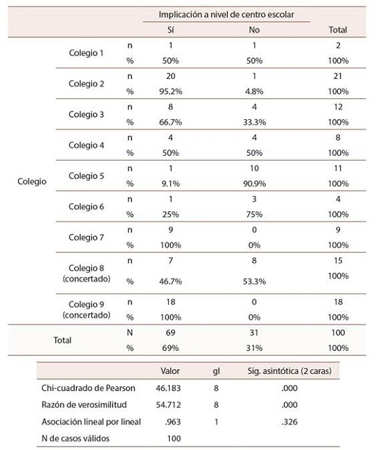 Al analizar en términos cuantitativos la implicación del centro escolar en su conjunto, se halla que existe una baja coherencia interna, puesto que se observan diferencias destacables en los colegios 3, 4 y 8. Concretamente, en los casos señalados existe una parte de la muestra que afirma que sí existen iniciativas a nivel de centro, mientras que el resto opina lo contrario (Tabla 4).