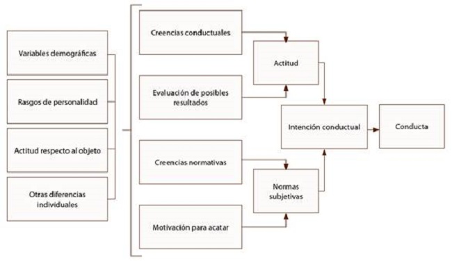 Existen varios modelos para predecir la aceptación tecnológica. Uno de los más referidos es el modelo de aceptación tecnológica (TAM, por sus siglas en inglés) desarrollado por Davis (1989). Este se basa en la teoría de la acción razonada de Fishbein y Ajzen (Figura 1), la cual plantea un sistema general para comprender el comportamiento humano a partir de las creencias individuales (Hill, 1977). De acuerdo con la teoría, la creencia de que realizar una determinada conducta va a producir un resultado particular, mediatizado por la actitud hacia dicha conducta y las normas subjetivas, determina la intención que precede la acción en sí (Montaño y Kasprzyk, 2015).