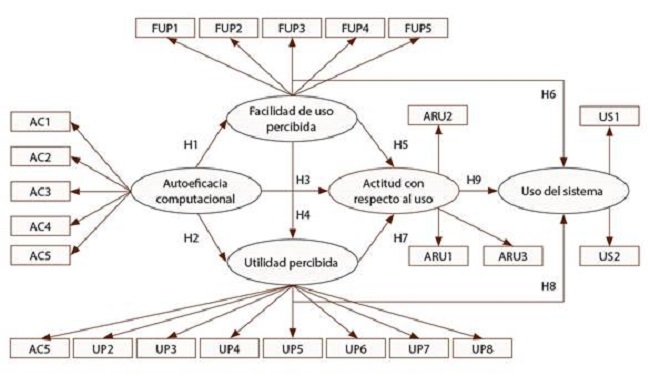 Se propuso un modelo que examina cuatro constructos (Figura 2). El primero es la autoeficacia computacional (AC), la cual da cuenta del grado en que el individuo cree tener la capacidad de realizar una tarea específica usando un dispositivo tecnológico (Venkatesh y Bala, 2008). Tiene un rol crucial modificando las actitudes que puede tener una persona con respecto a un sistema particular (Govender y Rootman-le Grange, 2015). Además, estudios previos han encontrado relaciones significativas entre esta y los factores originales (Venkatesh y Davis 1996; Venkatesh et al., 2000). Las siguientes hipótesis fueron planteadas: