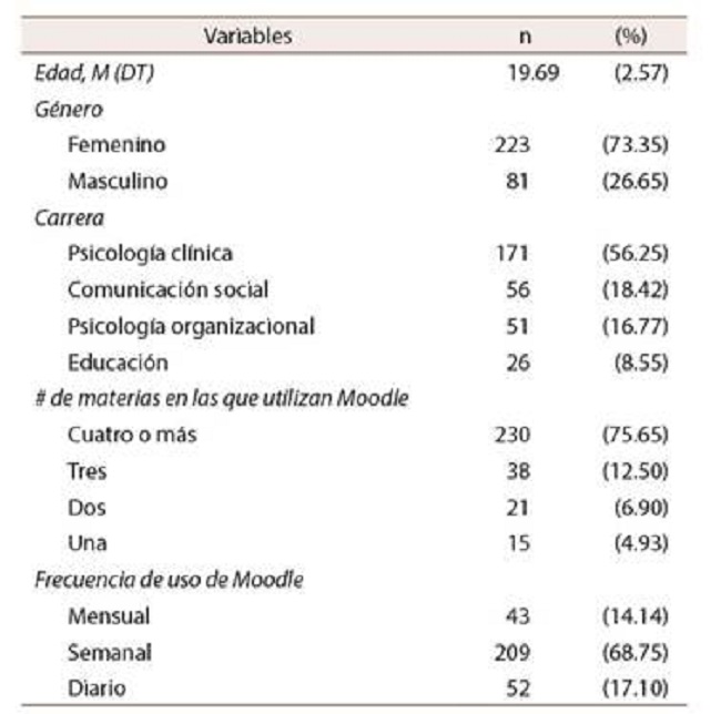 Participaron 309 estudiantes de la unidad curricular básica, correspondiente a los primeros tres semestres, de las carreras de Psicología Clínica, Psicología Organizacional, Comunicación Social y Pedagogía de la Universidad Católica de Santiago de Guayaquil (Tabla 1). Cinco fueron excluidos por incompletitud de respuestas. La muestra final consistió en 304 estudiantes entre 17 y 38 años (M=19.69; DT = 2.57). El 73% de la muestra es femenina con una edad promedio de 19,50 años (DT = 2.51) y el 23% es masculina con una edad promedio de 20,22 años (DT = 2,68). El 56,25% pertenece a Psicología clínica. El 75,65% utiliza Moodle en cuatro o más materias y el 68,75% lo hace semanalmente.