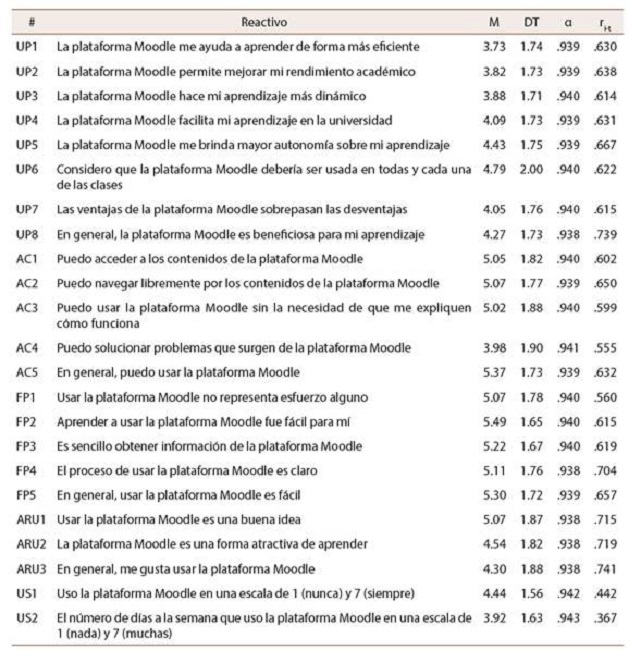 Los reactivos evalúan cinco factores: utilidad percibida (La plataforma Moodle me ayuda a aprender de forma más eficiente), autoeficacia computacional (Puedo acceder a los contenidos de la plataforma Moodle), facilidad de uso percibida (Usar la plataforma Moodle no representa esfuerzo alguno), actitud con respecto al uso (Usar la plataforma Moodle es una buena idea) y uso del sistema (Uso la plataforma Moodle en una escala de 1 (nunca) y 7 (siempre). Estos reactivos han sido empleados en múltiples investigaciones (Fathema et al., 2015; Govender y Rootman-le Grange, 2015; Solano Cóndor y Abella García, 2017; Tarhini et al., 2017).
