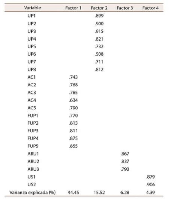 Dado que el instrumento pretende medir varios factores latentes, se optó por evaluar su unidimensionalidad. Tras confirmar la idoneidad de la muestra con el coeficiente de Kaiser-Meyer-Olkin (0.936) y la prueba de esfericidad de Bartlett (χ2 (253) = 5627.67; p<.001), se realizó un análisis factorial exploratorio (AFE) por el método de componentes principales con rotación promax. Se encontraron cuatro factores con eigenvalores superiores a la unidad que explican el 70,66% de la varianza y corresponden a FUP-AC, UP, ARU y US (Tabla 3). Se rechaza la hipótesis concluyendo que el instrumento mide más de un factor y su estructura tetrafactorial concuerda con la construcción teórica de los reactivos.