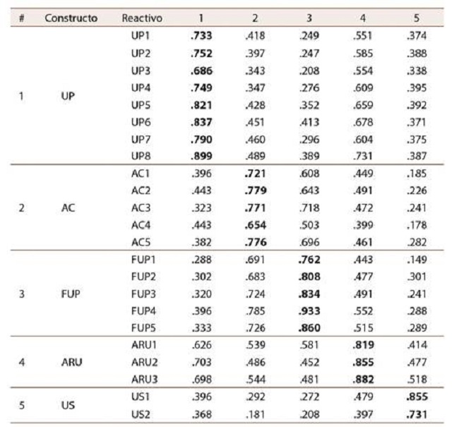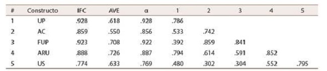 Las cargas factoriales se utilizaron para evaluar la confiabilidad de los reactivos y el índice de fiabilidad compuesta (IFC) de los constructos. Todos los reactivos reportaron cargas factoriales adecuadas (>0,70) a excepción de UP3 y AC4 que se mantuvieron por encima del valor crítico (0,4), por lo que fueron conservados, mientras que el IFC de cada constructo (>0,70) se mantuvo en los rangos óptimos (Hair et al., 2012).
