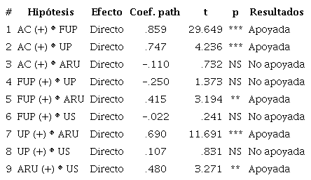 A continuación, la H4 establece que la FUP tiene un efecto positivo en la UP, pero con base en los resultados obtenidos, es rechazada (β = -0,250; t = 1,373; p > 0,05). En cambio, la H5, que plantea la FUP tiene un efecto positivo en la ARU es confirmada (β = 0,415; t = 3,194; p < 0,05). No obstante, la H6 que plantea que la FUP tiene un efecto positivo en la US también fue rechazada, con base en la magnitud de su coeficiente path, estadístico t y nivel de significancia (β = -0,022; t = 0,241; p > 0,05).