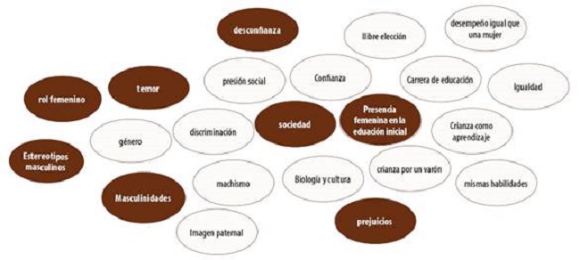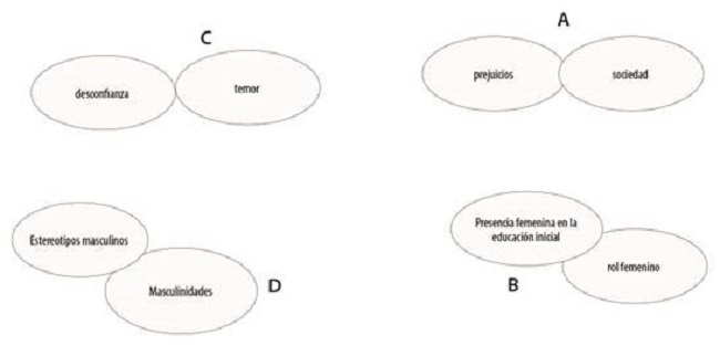 Las etiquetas más recurrentes que se presentaron fueron: rol femenino, temor, la desconfianza, los prejuicios, las masculinidades, los estereotipos masculinos, la presencia femenina en la educación inicial y la sociedad. Estas están asociadas a otras categorías de menor recurrencia que se vinculan entre sí por medio de relaciones que permitieron identificar otros conceptos generales. En una segunda codificación, las categorías anteriores fueron a su vez agrupadas en categorías que engloban algunos conceptos, las cuales se muestran en la Figura 2.