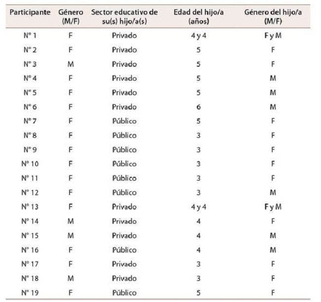 Las personas participantes en este estudio fueron padres y madres de niños del nivel inicial de varios centros educativos públicos y privados de Lima (Perú). Este nivel pertenece a la educación básica regular peruana, atendiendo edades desde 0 a 6 años. Se tomó en cuenta que al menos la mitad tuvieran hijos o hijas a cargo de un docente varón. Esto significó una complicación para el estudio, pues no es frecuente encontrar docentes varones en el nivel inicial (0 a 6 años) debido a la baja representación masculina en este contexto particular. Se pensó, desde el inicio, apostar por una participación equitativa entre padres y madres de familia. Sin embargo, durante el proceso, se presentaron cambios asociados a la accesibilidad y disponibilidad de cada participante, en especial a la de los padres de familia. En tal sentido, fue mayor la presencia de madres dispuestas a formar parte del grupo de estudio y con el tiempo necesario para el desarrollo de las entrevistas. La Tabla 1 presenta, a continuación, algunos alcances generales sobre las personas entrevistadas.