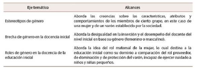 Las entrevistas semiestructuradas proporcionan mayor flexibilidad sin perder el foco de la conversación y tiene la capacidad de develar facetas escondidas del individuo (Qu y Dumay, 2011). Tales entrevistas se realizaron de manera presencial y en algunos casos por vía telefónica siguiendo tres ejes temáticos: (1) estereotipos de género; (2) brecha de género en la docencia inicial y (3) roles de género en la docencia de la educación inicial (Ver Tabla 2). Durante el proceso, se recordó a las personas participantes el propósito del estudio otorgándoles la oportunidad de llenar un consentimiento informado. Asimismo, se les solicitó el permiso correspondiente para realizar la grabación digital de la entrevista enfatizando la confidencialidad de sus respuestas con la finalidad de asegurar los procedimientos éticos previstos en el proceso de investigación. Para brindarles mayor seguridad y confianza a las personas participantes respecto al uso de la información obtenida, se solicitó también un compromiso a la institución asegurando que las opiniones no comprometerían el vínculo de las personas participantes ni el de las personas menores de edad; por ser absolutamente confidenciales y para fines estrictamente académicos.