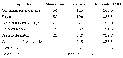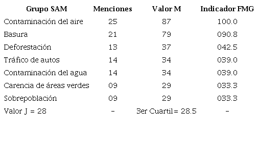 En lo que respecta al Grupo SAM, que alberga los aspectos más relevantes a considerar en el marco de la concepción de los retos de las Ciudades y Comunidades Sustentables, se tomó en cuenta la contaminación del aire, basura, deforestación, el tráfico de autos, contaminación del agua, la carencia de áreas verdes y finalmente la sobrepoblación, como se puede observar en la Tabla 3. La palabra definidora con mayor valor FMG recayó en la contaminación del aire que ostentó un peso de 87 dentro del Grupo SAM y que fue aludida por el 64.1% de las mujeres.