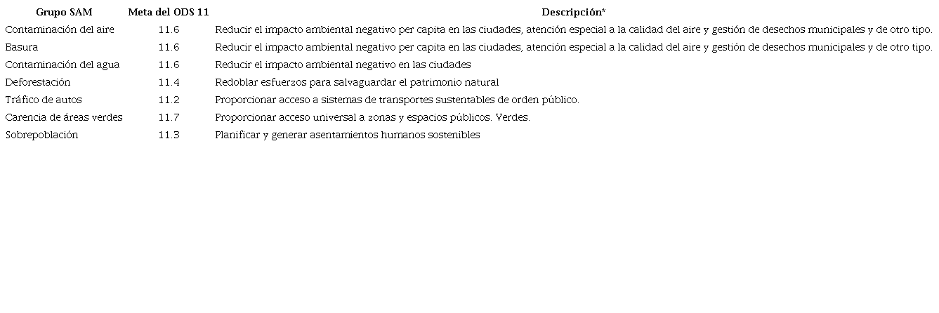 Mientras, el Grupo SAM, el cual agrupa las expresiones que los participantes consideraron como los retos más relevantes que enfrentarán las ciudades y las comunidades sustentables, incluyó la contaminación del aire, basura, contaminación del agua, deforestación, tráfico de autos, carencia de áreas verdes y, por último, la sobrepoblación. La noción definidora con mayor valor FMG porcentual fue contaminación del aire con un peso de 123 dentro del Grupo SAM. Además, fue mencionada por el 57.6% de los y las estudiantes participantes, como se observa en la Tabla 1.
