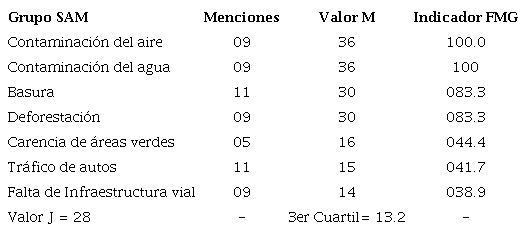 Por otro lado, en lo concerniente al Grupo SAM, lo varones consideraron como los principales retos de las Ciudades y Comunidades Sustentables, la contaminación del aire, contaminación del agua, basura, deforestación, tráfico de autos y la carencia de infraestructura vial, como puede ver en la Tabla 4. El vocablo definidor fue el que tuvo mayor valor FMG, en este caso, contaminación del aire y contaminación del agua, las cuales concurrieron en el 45% de las menciones de los varones.