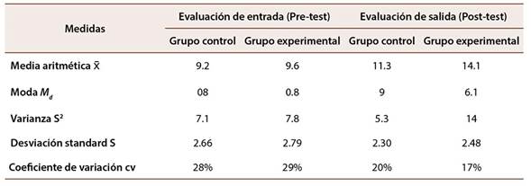 Después del proceso de tratamiento, el grado de dispersión de las notas a la media es de 5,3 en el grupo control y 6,1 en el grupo experimental, el promedio de desviaciones de las notas con respecto a la media aritmética es de 2,30 en el grupo control y 2,48 en el grupo experimental, el coeficiente de variabilidad con respecto al nivel de aprendizaje de los niños y las niñas del grupo control en la prueba de post-test es de 20% y en grupo experimental es de 17% el efecto dado por la aplicación de dicha estrategia.